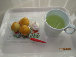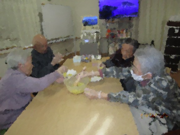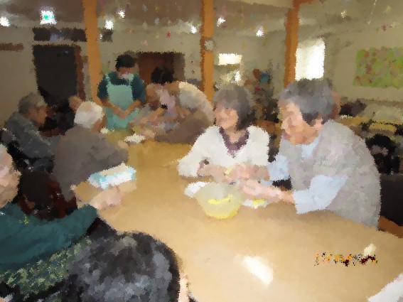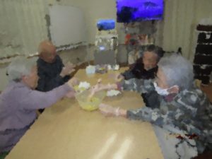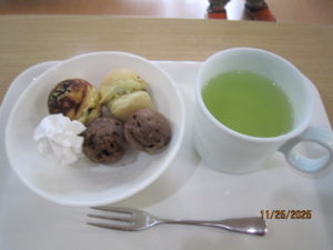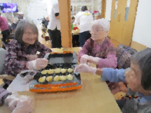 1回目は、ご利用者様には、材料をつぶしたり、丸めたりと手伝っていただき生クリームを添えてみました。(写真上段3枚)