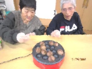 2回目は、職員の見守りの中、タコ焼き器に生地を流し入れたり中身のリンゴやあんこなどを乗せ、タコ焼き器で丸く仕上げました。